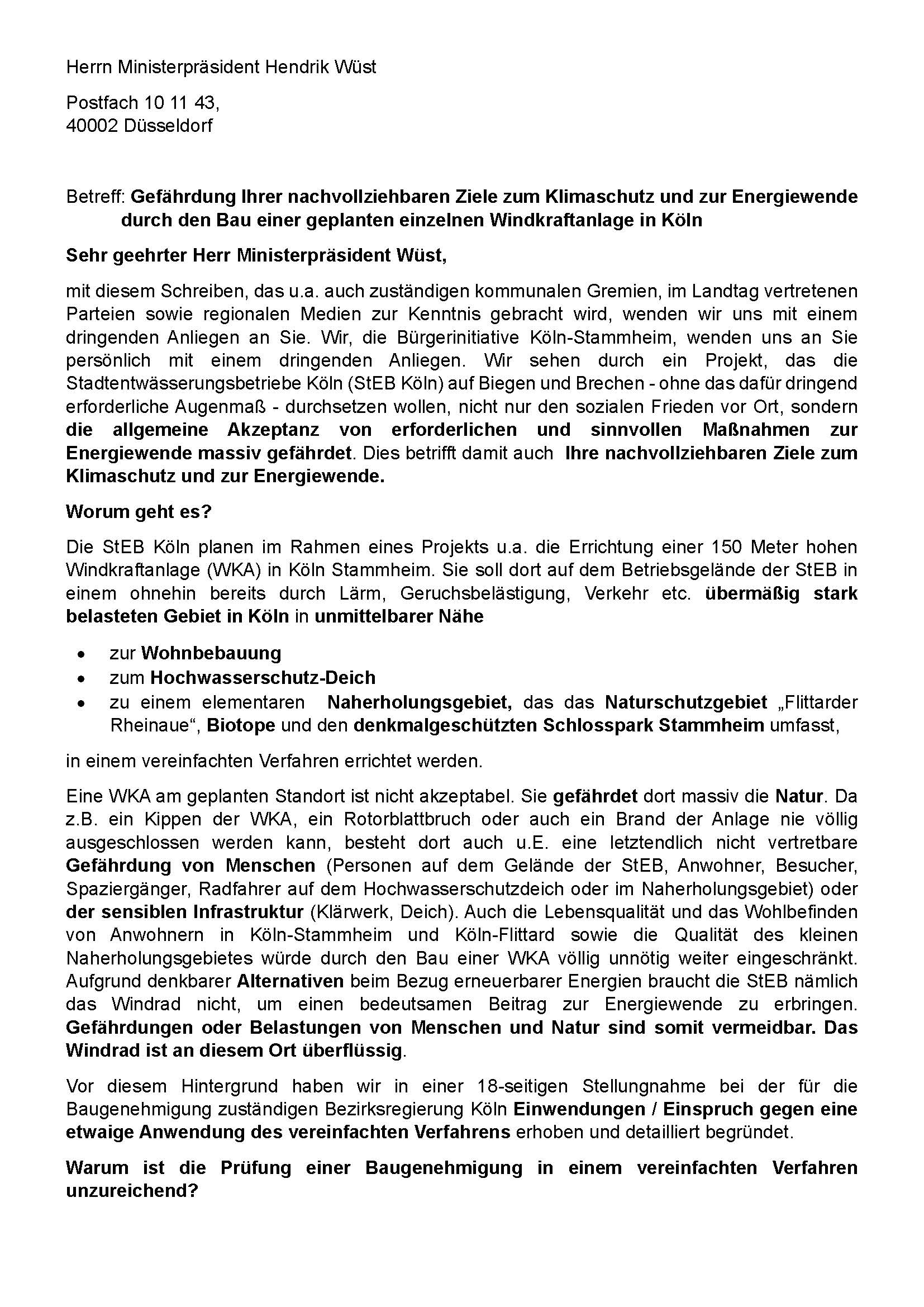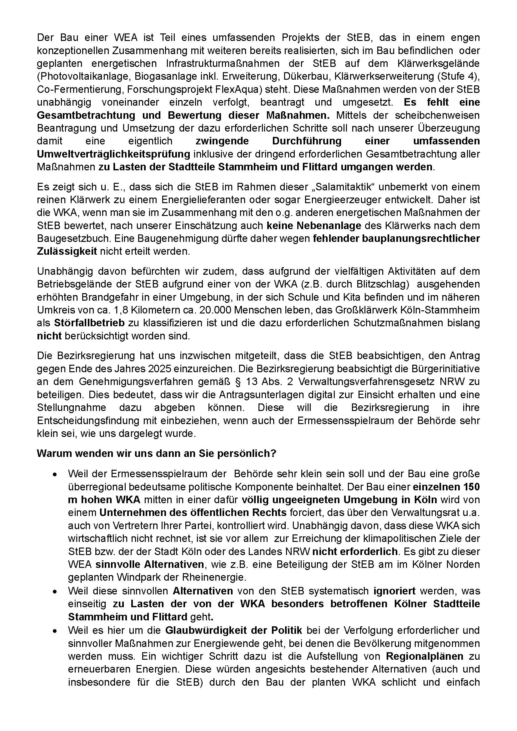 Wie aus den Medien und einer Informationsveranstaltung der Stadtentwässerungsbetriebe für die Öffentlichkeit am 24.04.2024 zu erfahren war, plant das Unternehmen die Errichtung einer ca. 150 m hohen Windenergieanlage (WEA) auf dem Werksgelände des Großklärwerks (GKW) Stammheim und damit in unmittelbarer Nähe zum Naturschutzgebiet (NSG 10) und den Naherholungsgebieten der Stammheimer / Flittarder Rheinaue sowie des Stammheimer Schlossparks. Diese Anlage ist dort jedoch nicht zwingend notwendig, da sie auch in weniger besiedelten Gebieten errichtet werden kann. Sie verursacht einen störenden Schattenwurf und beeinträchtigt nachhaltig die Lebensqualität der davon betroffenen Menschen. Sie emittiert dauerhaft störenden Betriebslärm, der zu den ohnehin vorhandenen Lärmbelastungen hinzuaddiert werden muss und daher inakzeptabel ist. Sie stellt in der kalten Jahreszeit eine Gefahrenquelle dar, deren Auswirkung nicht genau einschätzbar ist. Sie passt in keiner Weise ins Landschaftsbild eines bedeutenden Naherholungsgebietes und stellt einen der krassesten optischen Widersprüche in diesem Zusammenhang dar. Die Bauphase stellt eine zusätzliche Belastung im Verkehrsraum dar, die parallel zum Dükerneubau und den notwendigen Erweiterungsbauten des künftig noch weiter ausgedehnten Betriebsgeländes ertragen werden müsste. Die Bürger in Flittard und Stammheim leisten im Gegensatz zu den meisten anderen Stadtteilen bereits jetzt schon einen überproportional hohen Solidarbeitrag zum Gemeinwohl der Stadt und der angrenzenden Großunternehmen, insbesondere für die Stadtentwässerungsbetriebe.