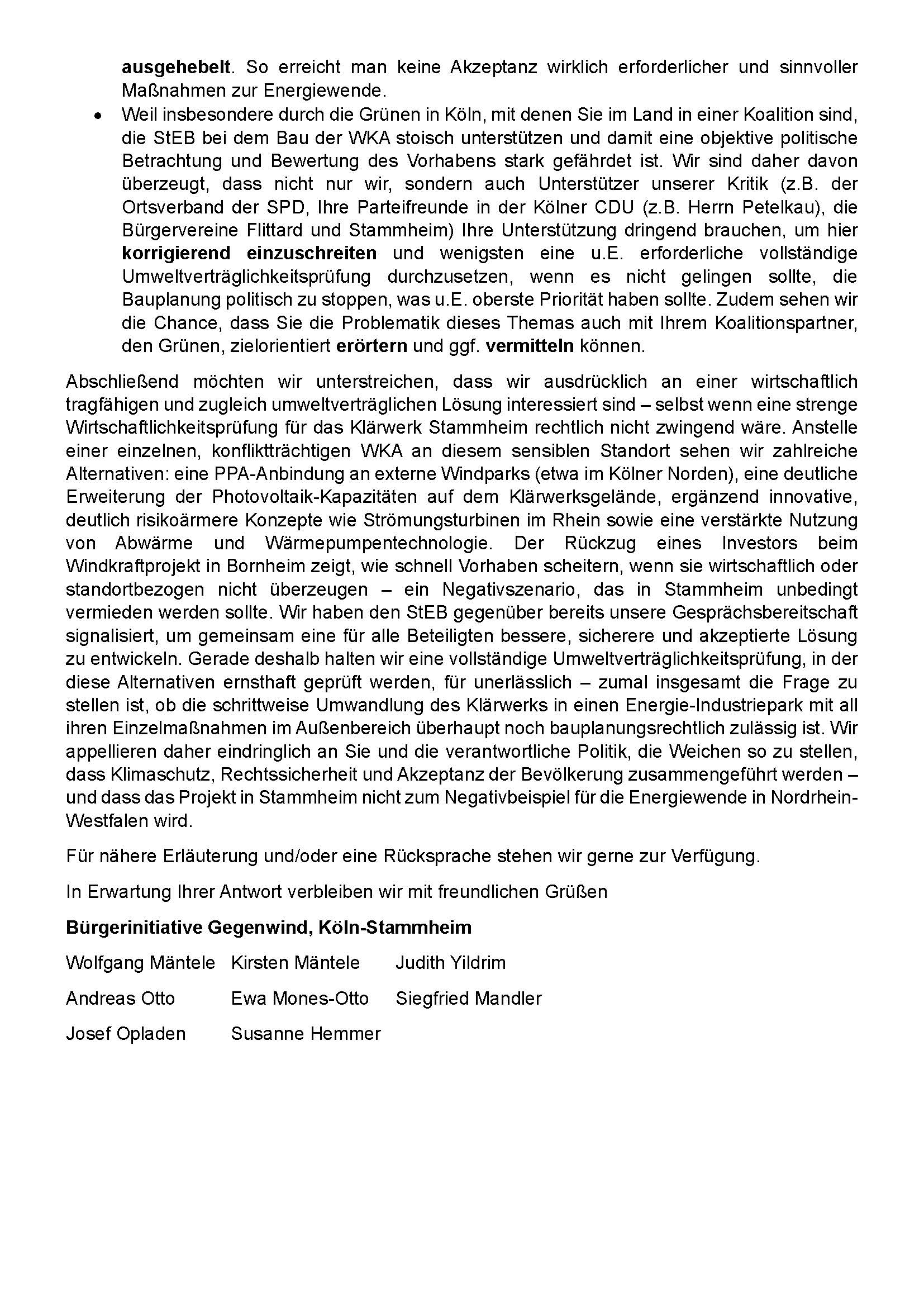 Aus diesen Gründen hat der Vorstand des Bürgervereins Köln-Flittard am 15. Juli 2024 einstimmig beschlossen, sich in größtmöglicher Form gegen den geplanten Bau einer WEA im GKW Stammheim zur Wehr zu setzen. Wir empfehlen allen Bürgern, sich angesichts der Auswirkungen speziell dieser WEA an dieser Stelle mit der Gemeinschaft der direkt und indirekt Betroffenen solidarisch zu erklären und gegen diese Planung zu opponieren und die Genehmigungsbehörden aufzufordern, dem Bau nicht zuzustimmen. Hierzu empfiehlt der Bürgerverein Köln-Flittard, die aktuelle Online-Petition der „Bürgerinitiative GEGENWIND KÖLN-STAMMHEIM“ mit einer Unterschrift zu unterstützen: